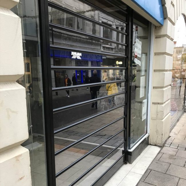 This roller shutter is concealed in the day up in the soffit above the shop, operated by remote control and is made from a clear polycarbonate plastic material